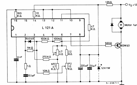 Este circuito controla un ventilador en el coche, de acuerdo con la temperatura, accionándolo de modo automático cuando la temperatura sube. El circuito es del manual de circuitos integrados lineales de la SGS de 1982. El transistor Darlington puede ser sustituido por un equivalente de la serie TIP con al menos 10 A de corriente de colector, montado en disipador de calor.