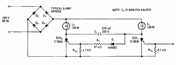 Este circuito, que sólo funciona con lámparas incandescentes, fue obtenido en una documentación americana de 1977. Con él podemos disminuir el brillo de una lámpara al mismo tiempo que el brillo de la otra aumenta. El control se puede realizar con una señal PWM aplicada a la entrada. La potencia máxima de las lámparas depende del SCR quedando alrededor de 200 W para las de la serie TIC y el circuito también funciona en 220 V.