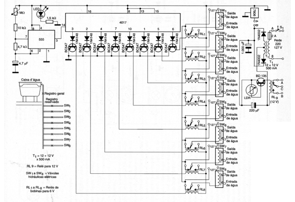 El proyecto presentado es simple pero eficiente en la irrigación de media distancia. En este circuito, la base de tiempo es un 555 que genera una señal de reloj que se aplica a un contador 4017. La frecuencia de los pulsos se puede ajustar a través de un trimpot de 1 M ohmios. Las válvulas usadas son del tipo solenoide hidráulicas encontradas en lavadoras, pero otras equivalentes y de mayor tamaño, incluyendo las trifásicas pueden ser usadas. El robot también se puede programar para ser utilizado solamente durante la noche o solamente durante el día. El programa se realiza a través de puentes en RL-9, ya que está en el circuito que identifica si hay o no presencia de luz solar. El LDR funciona como sensor, pudiendo ser de cualquier tipo. Todos los relés son de 6 V, excepto RL9. El circuito integrado 7806 debe ser montado en radiador de calor y T1 tiene secundario de 12 + 12 V con corriente de 500 mA o mayor. Todas las entradas de agua van a un depósito, como se indica en la figura. El circuito original está indicado para la red de 127 V pero se puede utilizar también en 220 V. (2005)
