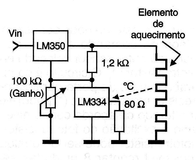 Un elemento de calentamiento de baja tensión (hasta 30 V) con corriente de hasta 3 A puede ser controlado de forma precisa con el circuito que presentamos. El ajuste del punto de funcionamiento (temperatura) se realiza en el potenciómetro de 100 k ohmios. El sensor de temperatura debe montarse en el mismo lugar en el que está el elemento de calentamiento. El circuito integrado debe montarse en un radiador de calor. La tensión de entrada debe ser por lo menos unos 3 V más que la tensión que tiene que ser aplicada al elemento de calentamiento, en las condiciones de máxima temperatura.