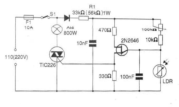 La idea básica del circuito presentado en la figura es aumentar el brillo de una lámpara incandescente común cuando la cantidad de luz ambiente que incide en el sensor disminuye. Colocado en una habitación, hará que las luces aumenten de brillo a medida que se oscurezca, de manera suave ocurriendo el efecto inverso al amanecer. Evidentemente, la misma configuración puede ser modificada para operar con otros tipos de sensores. Así, si en lugar del LDR utilizamos un NTC, y como carga un calentador, el circuito pasará a calentar un ambiente cuando su temperatura disminuya, funcionando así como un termostato. Evidentemente, según el rango de control deseado y las propias características del sensor pueden ser necesarios cambios de valores de componentes. El TRIAC utilizado con sufijo B opera en la red de 110 V y con sufijo D en la red de 220 V permitiendo un control de corrientes de carga de hasta 8 ampères.
