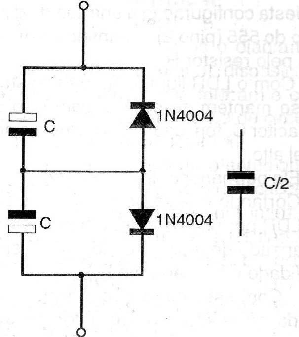 Podemos utilizar capacitores electrolíticos de gran valor en circuitos de corriente alterna con la configuración mostrada en la figura. La capacitancia obtenida, para dos capacitores iguales asociados será equivalente a la mitad del valor de esos capacitores. Los capacitores deben tener una tensión de trabajo mayor que el valor de pico de la tensión alterna en que se pretende usarlos.