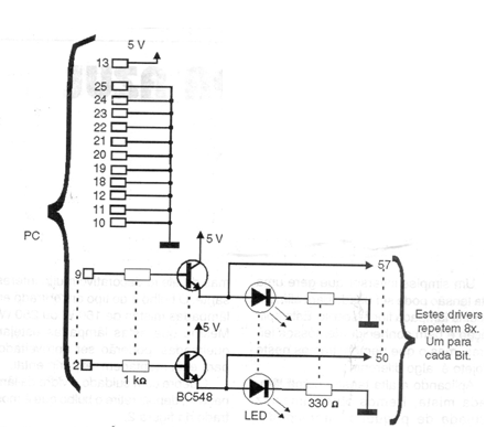 Si el lector posee un antiguo PC que todavía utiliza puerto paralelo y desea utilizarlo en sus proyectos de control y automatización, el shield que presentamos abajo es muy simple. Este circuito de baja potencia para corrientes de hasta 100 mA permite el accionamiento de relés, pero se pueden utilizar transistores de mayor corriente como el BD135 para el accionamiento directo de cargas hasta 500 mA. El circuito es de una documentación de 1997.