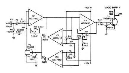 Este circuito es de una documentación técnica de Motorola de los años 70, pero puede ser montado fácilmente hoy con FETs comunes como el BF245 y un bipolar como el 2N2222 o BC548. Los operacionales son los conocidos 741. La fuente debe ser simétrica y las tensiones cercanas se pueden utilizar dependiendo de la aplicación.