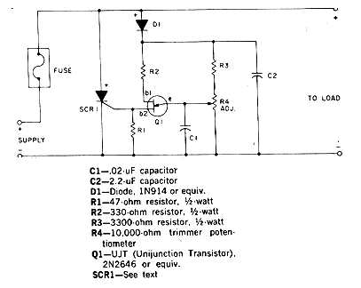 En una publicación de 1976, este circuito aprovecha el punto de disparo del unijuntura, que se puede ajustar en R4 para activar un SCR que pone en corto una fuente quemando el fusible. Así, podemos quemar el fusible cuando la tensión sobrepasa el valor ajustado, Protegiendo la carga alimentada. El SCR puede ser el TIC106 y la tensión de alimentación del circuito puede quedar en el rango de 9 a 30 V típicamente.