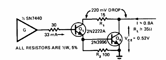 El circuito mostrado en la figura tiene una velocidad de conmutación muy alta, pudiendo trabajar con corrientes hasta 800 mA. Q2 puede ser un TIP31 u otro transistor de potencia según la carga. El circuito es de una documentación de los años 70.