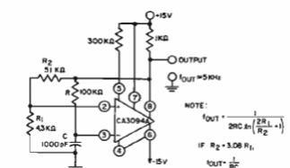 Este circuito tradicional es de una publicación técnica de la RCA de 1972. El circuito puede ser desarrollado con operativos más modernos. Las fórmulas se dan junto al diagrama y la fuente de alimentación debe ser simétrica. La frecuencia máxima depende del funcionamiento utilizado.
