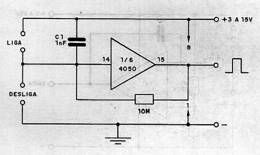 Los sensores de este circuito son placas metálicos separadas, pero debe ser tocado de forma simultánea. La resistencia de la piel es suficiente para hacer que el circuito dispare. La salida debe ser aplicada a una etapa de transistor u otro tipo de acuerdo con la carga de salida. La alimentación debe hacerse con tensión de 3 a 15 V y la conexión a tierra es importante.