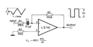 El circuito integrado LS141 es bastante similar al 741, El circuito es del manual de circuitos integrados lineales de la SGS de 1982. La fórmula junto al diagrama se utiliza para calcular R2 y C1 según la frecuencia.