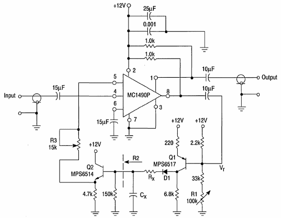 El integrado utilizado no es muy común en nuestros días. Los transistores pueden ser sustituidos por equivalentes más modernos. El circuito es del Handbook Linear Interfaz IC de Motorola de 1993. La fuente no necesita ser simétrica.