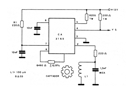 Este circuito es sugerido por la RCA y se basa en un circuito integrado dedicado que es el CA3165. El circuito no utiliza platino teniendo en su lugar un captador inductivo que, a partir de L1 envía las señales de disparo al circuito de potencia que acciona la bobina. Observe que para obtener pulsos precisos en la entrada del circuito se utiliza un condensador de mica plateada.