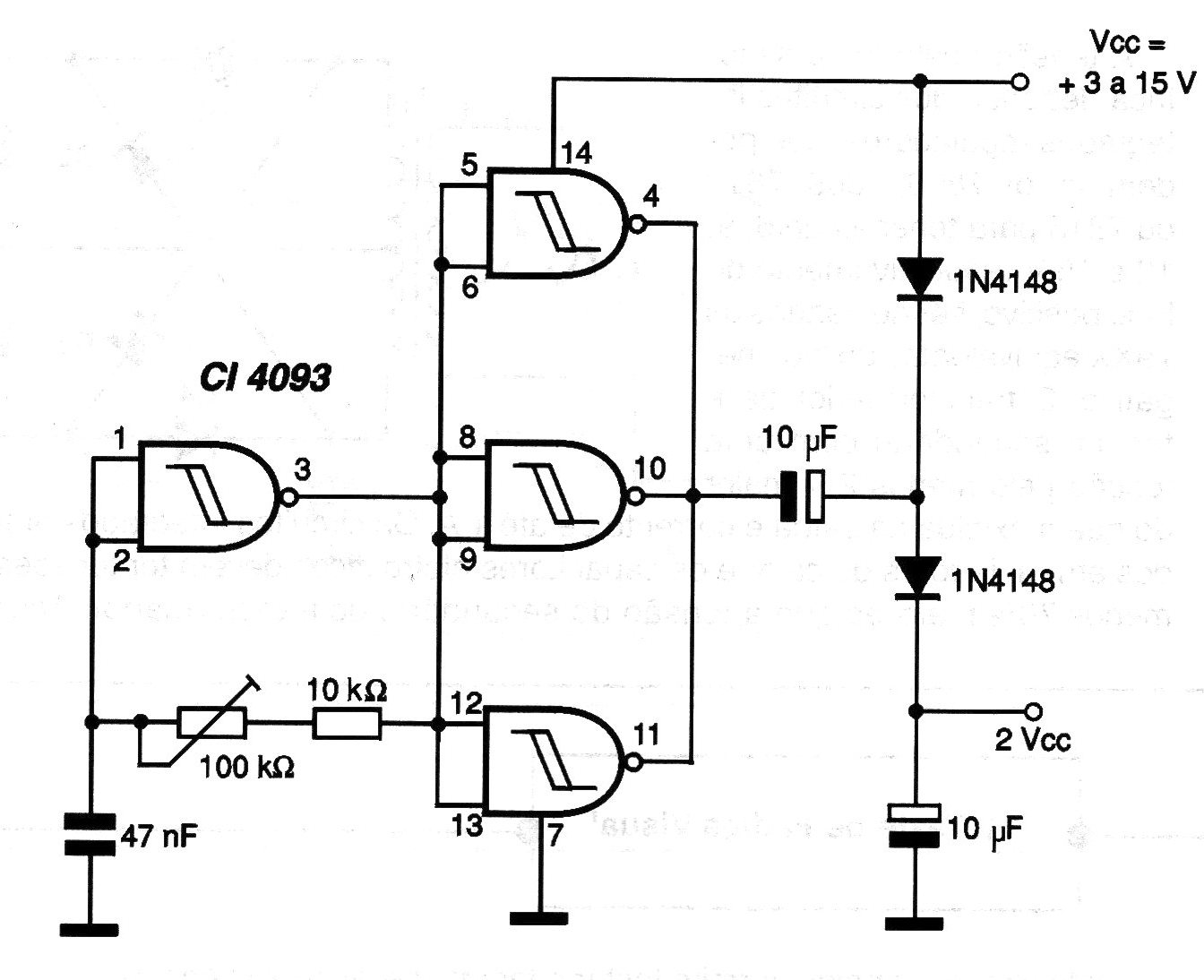 Este doblador de tensiones es indicado para aplicaciones en las que se necesita una tensión igual al doble de la aplicada en la entrada, pero régimen de muy baja corriente (para polarización solamente). La corriente de salida se limita a unos pocos microampères. El ajuste del punto de mejor rendimiento se realiza en el trimpot de 100 k ohms. El capacitor determina la frecuencia del circuito, pudiendo ser alterado conforme a la aplicación. Con la utilización de una etapa de potencia transistorizada en la salida del oscilador es posible elevar la capacidad de corriente de este doblador. Podemos utilizar un Power-FET o incluso un bipolar como el BD135 que, por supuesto, debe ser montado en radiador de calor.