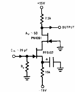 Este circuito se puede utilizar con señales de hasta 1 MHz. El circuito es de National Semiconductor FET Databook, pudiendo utilizar otros transistores de efecto de campo equivalentes.