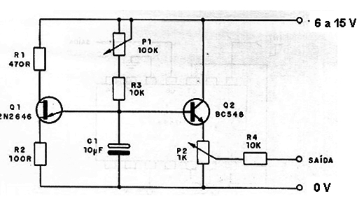 Este circuito utiliza un transistor unijunción que ya no es un componente fácil de encontrar, y hay soluciones equivalentes más modernas. Sin embargo, el circuito tiene un propósito didáctico, generando un tono de audio cuya frecuencia está ajustada en P1 y cuya intensidad se ajusta a P2. La frecuencia central depende de C1 que puede tener valores entre 10 nF y 10 µF. La banda de frecuencia se extenderá por varias decenas de kilohercios. La alimentación debe hacerse con tensiones de 6 V a 15 V.