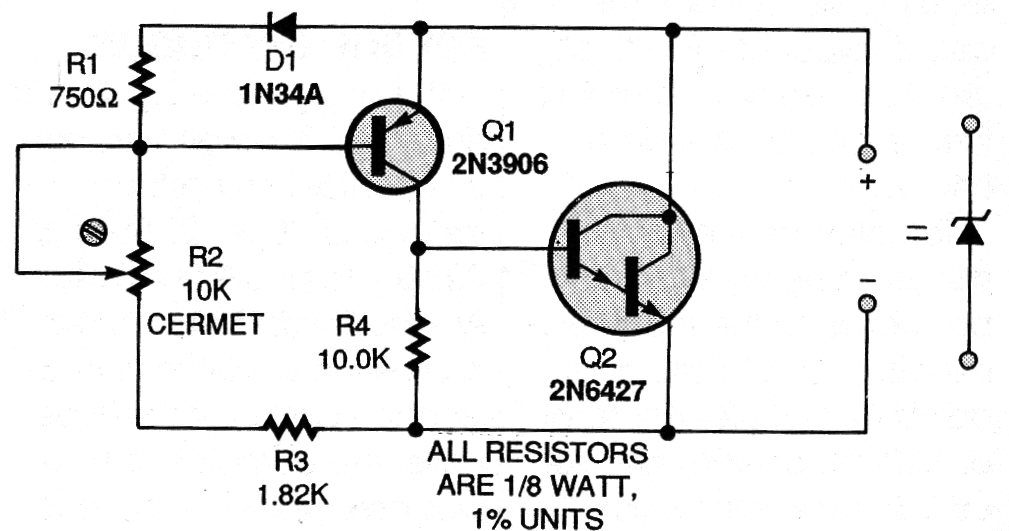 El circuito presentado simula un zener de alta potencia que depende de las características de Darlington usado. Este transistor puede ser cualquiera de la serie TIP. El ajuste de la tensión zener simulada se realiza en un trimpot. El transistor de potencia debe estar dotado de un disipador de calor.