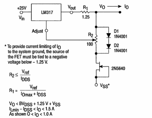 La corriente máxima de este circuito es 1,5 A. El circuito tiene las fórmulas junto al diagrama para calcular los componentes según la aplicación. Encontramos esta configuración en el Linear Interfaz IC de Motorola de 1993.