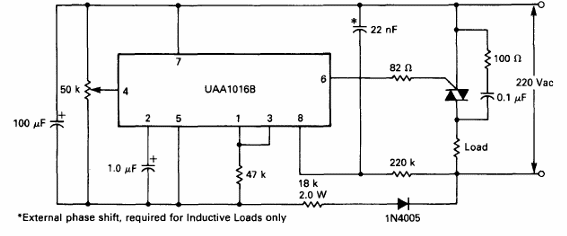 El circuito integrado utilizado es poco común en nuestros días. Encontramos esta configuración en el Linear Databook de Motorola de 1990. El triac puede ser cualquiera de la serie TIC.