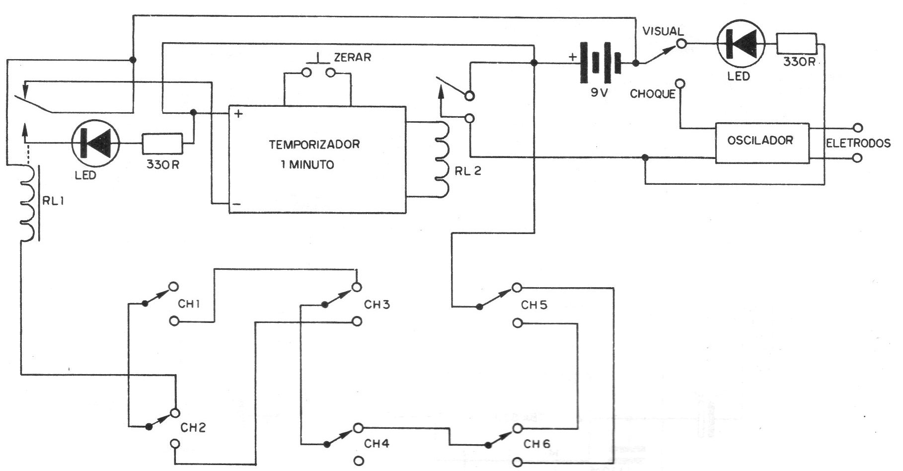 Con este nombre ya publicamos un interesante juego. Para los lectores que no conocen, este juego consiste en lo siguiente: el jugador tiene que encontrar la combinación de llaves que desarma el temporizador del circuito, o sea, impide la "explosión de la bomba", lo que será indicado por el encendido del LED verde. Si no puede encontrar esta combinación de desarme, tenemos 2 posibilidades: o enciende el LED rojo, dando la indicación visual, o un oscilador de choque (conductor de nervios) se acciona "castigando" al jugador. El temporizador, que puede ser de cualquier tipo, determina el tiempo que el jugador tiene para encontrar la combinación de desarme, que en el caso es dada por: CH5 hacia arriba - CH6 hacia abajo - CH4 hacia arriba - CH3 hacia arriba - CH1 hacia abajo - CH1 hacia abajo y CH2 hacia arriba. El circuito simplificado se da en la figura.
