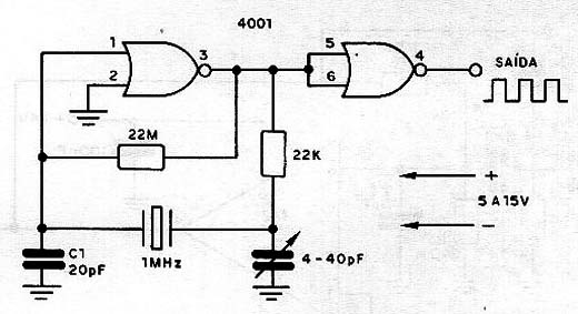 El circuito presentado genera una señal precisa en la frecuencia del cristal utilizado. El capacitor de sintonía sirve para ayudar al circuito partir de forma automática cuando se conecta. La señal es rectangular y la alimentación se hará con tensiones de 5 a 12 V. Otras funciones que se pueden conectar como inversores como de 4001 se pueden utilizar en este circuito.