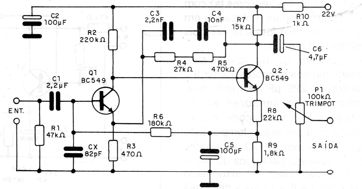 Este circuito con transistores de una publicación de 1995. El circuito es alimentado por una tensión tomada del propio amplificador. El consumo de corriente es muy bajo. Los transistores usados son comunes. La impedancia de entrada es de 50k.