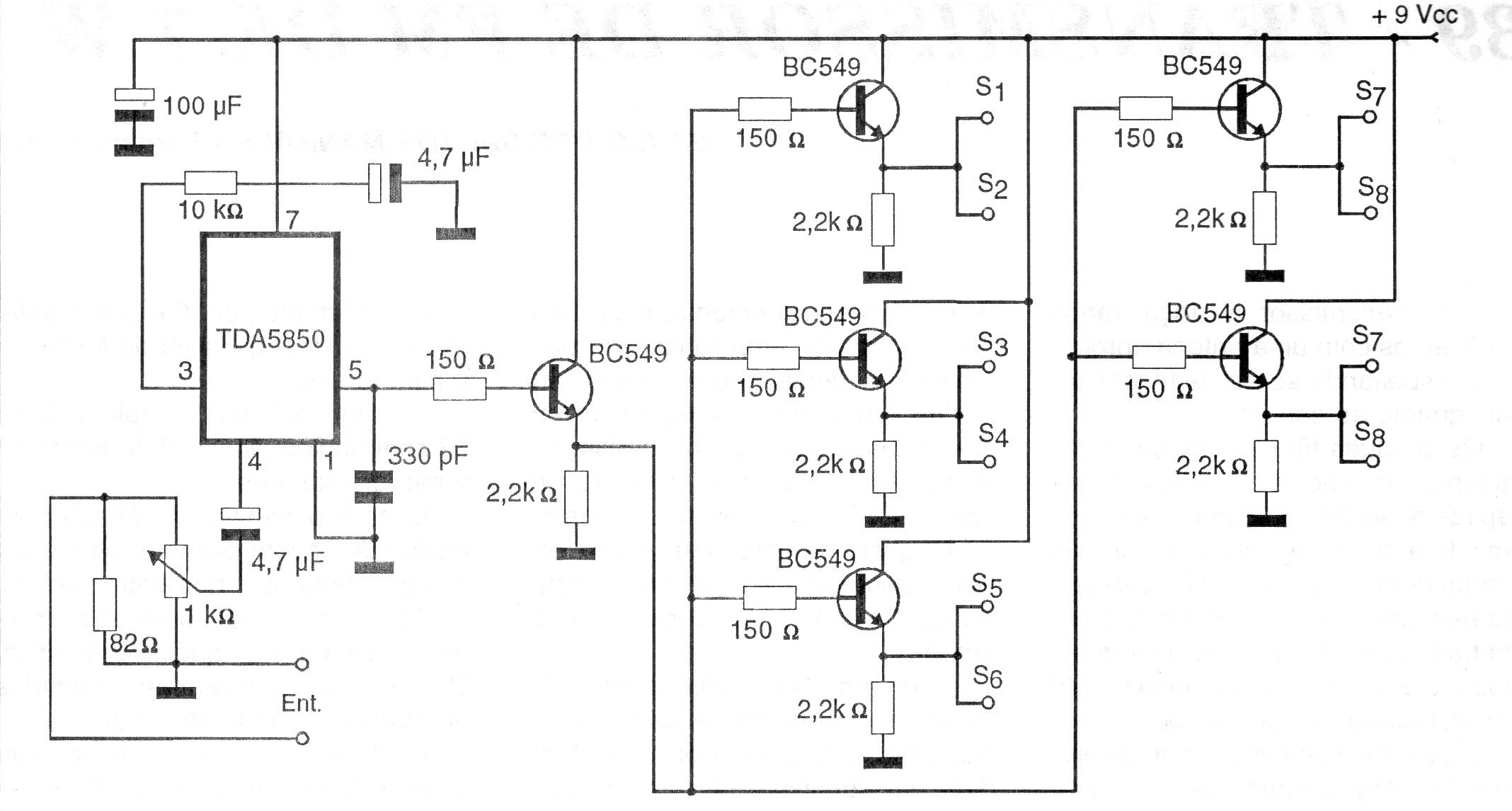 Encontramos este circuito en una documentación de 1997. Está destinado a la distribución de señales de vídeo compuesto entre varias salidas, en un sistema de TV interno, por ejemplo. El circuito funciona sólo con TV analógica, ya que se utiliza la señal de vídeo compuesto. La alimentación debe provenir de una fuente de 9 V.