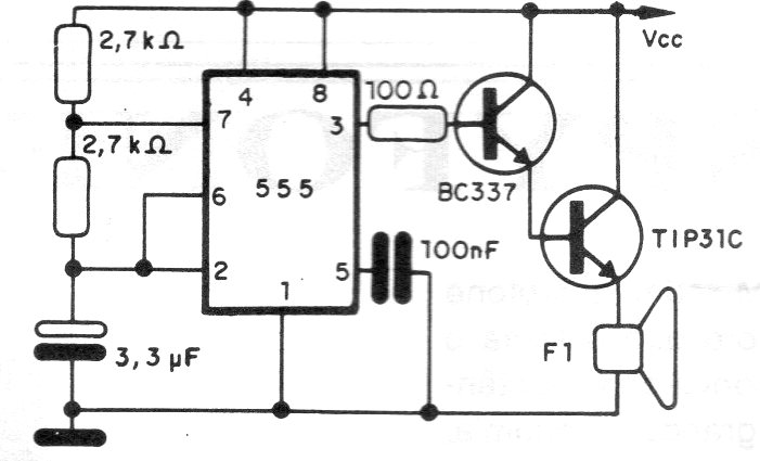 Las ondas sonoras aplicadas en el tanque de corrosión de placa de circuito impreso pueden acelerar el proceso. La idea de este proyecto de revista de 1994 es acoplar un altavoz conectado a un oscilador al tanque de corrosión para transmitir sus ondas sonoras. La frecuencia ideal debe ser obtenida experimentalmente alterando el capacitor en los pinos 2 y 6 del 555 que puede quedar entre 100 nF y 3,3 uF. La alimentación se puede hacer con tensiones de 5 a 12 V y el transistor de potencia debe estar dotado de un disipador de calor.