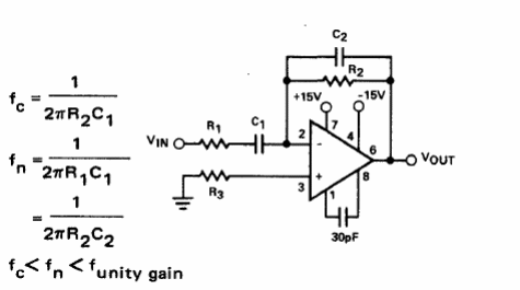 Encontramos este circuito en el manual de circuitos integrados de la Signetics de 1972. Operacionales equivalentes pueden ser utilizados y las fórmulas para calcular los componentes están junto al diagrama.