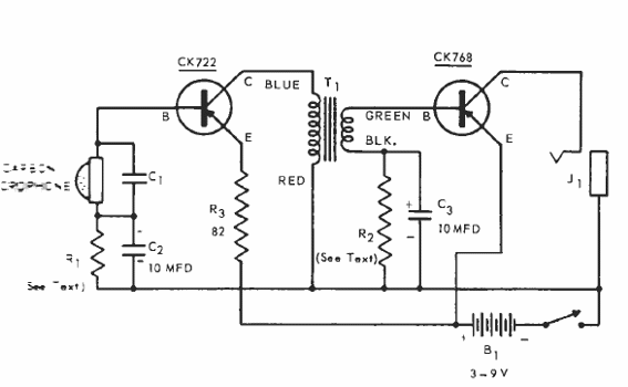 Con este nombre, encontramos este estetoscopio electrónico con micrófono de carbón en una publicación sobre transistores de Raytheon de 1957. Los resistores sin valor deben ser obtenidos experimentalmente en el rango de 10k a 47k. El auricular debe ser magnético de alta impedancia.