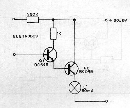 Se trata de una llave de toque experimental sensible con transistores. Dos transistores están conectados en configuración Darlington controlando una pequeña lámpara de 50 mA x 6 V. No utilizar bombillas de mayor tamaño. El circuito puede ser alimentado con 6 o 9 V, 9 V, pero una lámpara para esta tensión debe ser utilizado. Los electrodos son de metal debiendo ser tocados simultáneamente. Para lámparas mayores se pueden usar los BD135.