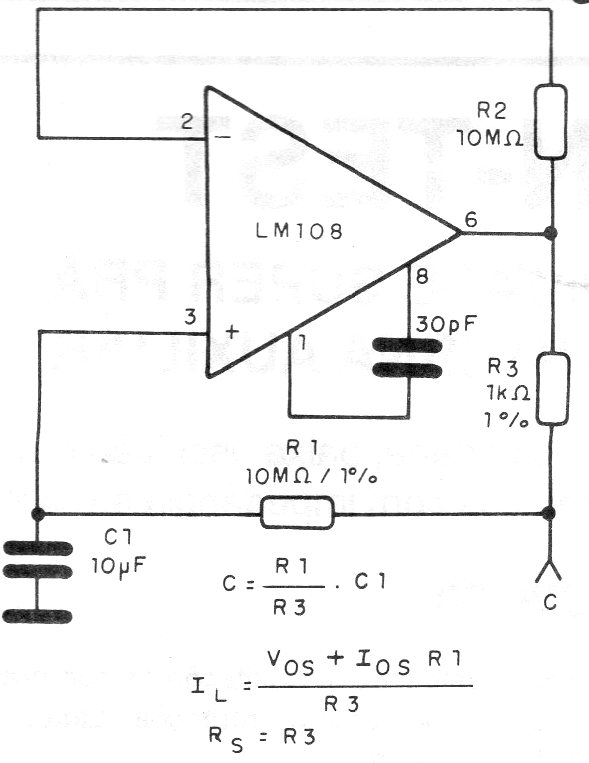 Esta es la versión convencional de multiplicador de capacitancia con amplificador operacional que aparece en otros artículos de esta sección. La fuente es simétrica y las fórmulas para calcular los componentes se dan junto al diagrama.