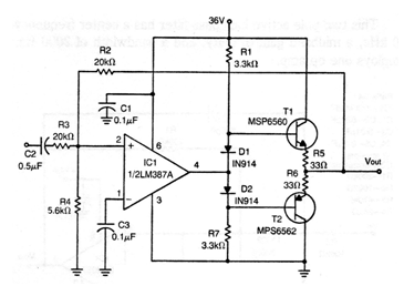 Esta configuración de una publicación americana de los años 70 muestra cómo utilizar un par de transistores de potencia como los TIP31 y TIP32 para aumentar la capacidad de corriente de la salida de un amplificador operacional. El circuito no utiliza fuente simétrica y el circuito integrado utilizado es un amplificador de audio integrado no más común en nuestro mercado. El circuito se puede utilizar como un amplificador de audio de potencia.