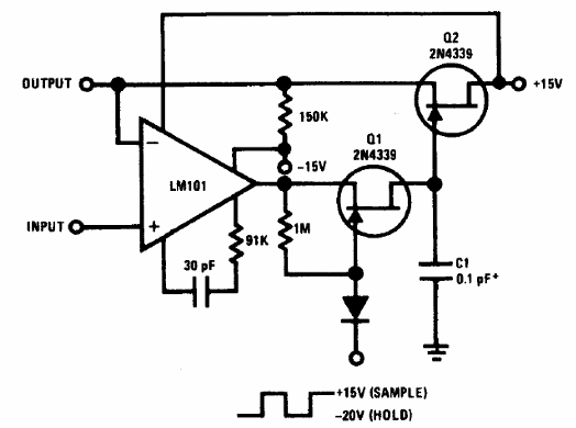 El circuito Sample and Hold mostrado en la figura fue encontrado en un Linear Applications Handbook de National Semiconductor de 1994. Los FET pueden ser los BF245 y el operacional puede ser un equivalente más moderno. El capacitor C1 debe ser de policarbonato.