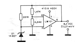 El circuito presentado sirve de referencia de tensión para ajuste de instrumentos. El diodo utilizado como referencia es del tipo con compensación de temperatura, no debiendo ser sustituido. Los resistores utilizados son de 1% de tolerancia, requisito importante para un circuito de precisión como éste.