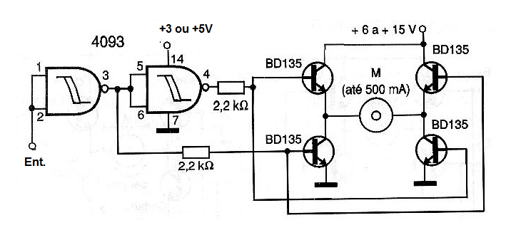 Este circuito tiene sólo dos estados posibles 1 o 0 en la entrada, con el motor girando en un sentido u otro. Para parar o colocar un comando adicional, por ejemplo, con relé o transistor en serie con la alimentación. La alimentación del circuito integrado debe realizarse con la misma tensión de salida utilizada en el microcontrolador. Los transistores deben estar dotados de disipadores de calor. Los transistores equivalentes de mayor corriente como los TIP31 pueden ser usados.