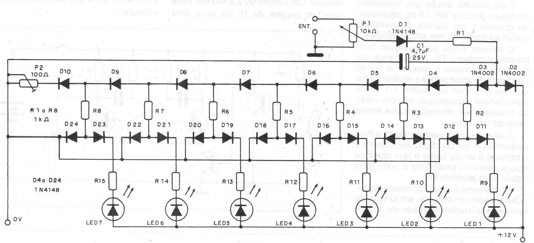 Este circuito es de 1993, pero por su simplicidad se puede agregar a cualquier amplificador. R1 depende de la potencia del amplificador, pudiendo tener valores entre 100 ohms hasta 1 k. El lector debe hacer experimentos y el potenciómetro P1, preferiblemente debe ser de cable para los amplificadores de mayor potencia.
