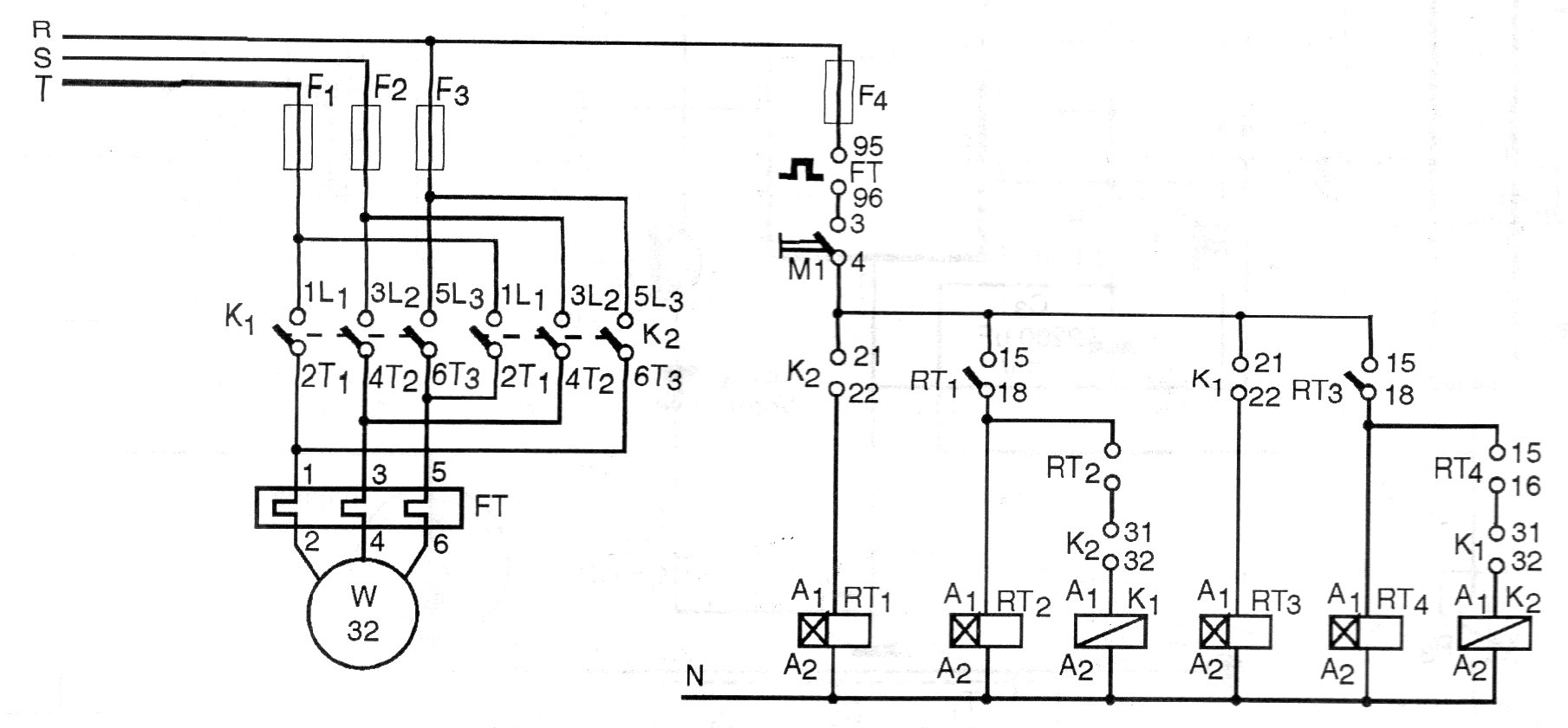 Encontramos este circuito en una documentación de 1997. Con él es posible invertir de forma automática el sentido de rotación de un motor trifásico. El circuito utiliza temporizadores y contactores de WEG.