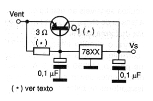 El bloque presentado en la figura, si bien es conocido por muchos lectores, no siempre está en la memoria de cada uno de forma completa. Con él es posible obtener corriente mayor que 1 A de cualquier regulador de la serie 78XX, dependiendo sólo del transistor empleado. Para un TIP42, por ejemplo, podemos llegar fácilmente a los 3 A, siempre que sea montado en buen radiador de calor. El resistor de 3 ohmios determina la corriente en el regulador, que debe quedar en torno a 0,2 A. Eventualmente debe ser disminuido ese valor para obtener una excitación mayor de un transistor de menor ganancia y mayor corriente de salida. El circuito regulador de tensión también debe montarse en un radiador de calor. Los circuitos integrados de la serie, entre el 7805 y el 7824 se pueden utilizar, siempre recordando que la tensión de entrada debe ser por lo menos 2 V mayor que la tensión deseada en la salida.