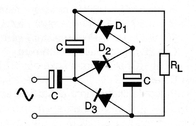 El circuito mostrado en la figura triplica la tensión alterna proporcionando una tensión continua de salida con aproximadamente 3 veces el valor de pico de la tensión aplicada en la entrada. Los diodos deben tener una tensión inversa de pico de al menos el doble de la tensión de pico de la red y los condensadores también. Los valores de los condensadores, en el rango de 100 nF a 50 uF dependen de la corriente deseada en la salida.