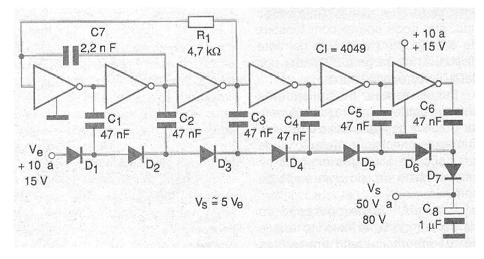 En este circuito tenemos la multiplicación de la tensión por 5, obteniéndose entre 50 y 80 V de salida cuando la tensión de entrada varía entre 10 y 15 V. Observe que el teorema de la conservación de energía es válido aquí, como en cualquier otro caso en que ocurren transformaciones de ese tipo. Cuanto mayor sea la tensión de salida, menor será la intensidad de la corriente obtenida. La frecuencia de operación depende de R1 y C7, componentes que pueden tener sus valores alterados en el sentido de obtener mejor rendimiento. También es importante observar que otros inversores pueden ser usados ??en la misma configuración y que varios de estos pasos pueden ser asociados en el sentido de aumentar aún más la tensión de salida. Por ejemplo, si se conecta D6 a la entrada de una etapa con otros seis inversores (sin osciladores), podemos multiplicar por 10 la tensión de entrada, obteniendo entre 100 y 150 V de salida cuando la tensión de entrada varía entre 10 y 15 V. Un circuito de este tipo se puede utilizar perfectamente para encender una lámpara de neón en serie con una resistencia de 220 k ohms a 1 M ohms en un sistema de señalización.