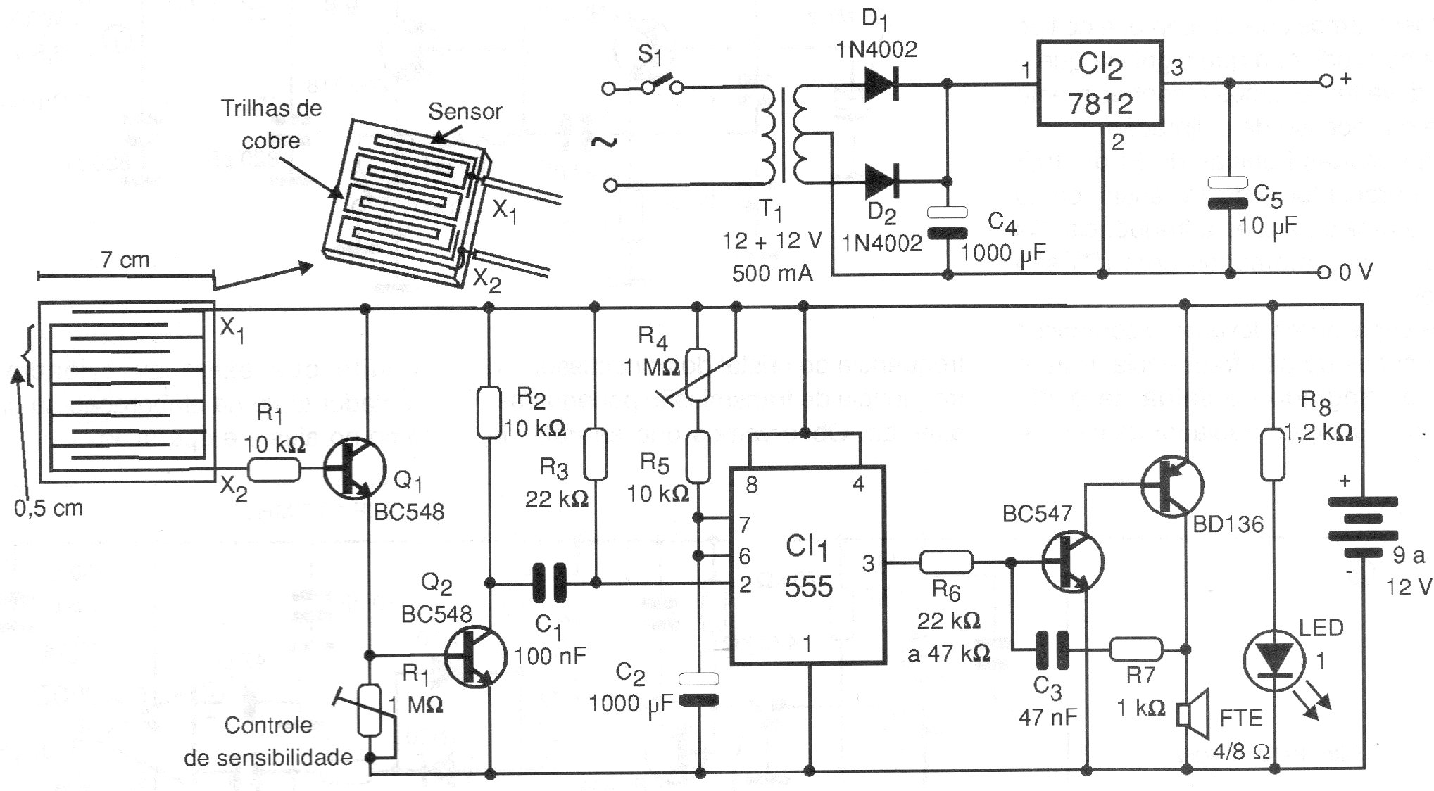 Este simple circuito de alarma de humedad incluye un oscilador de aviso temporizado cuyo tiempo se ajusta en R4. El circuito es de una documentación de 1999 y los detalles del sensor se dan. R1 hace el ajuste del punto de disparo. La alimentación puede ser hecha por la fuente indicada o por batería de 9 a 12 V.
