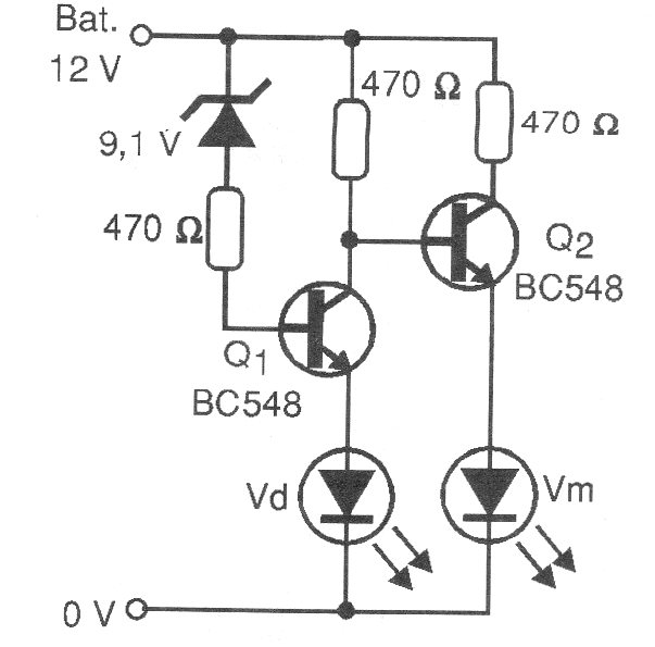 Este simple circuito indicador utiliza dos transistores indicando cuando la tensión de una batería de 12 V está por debajo de 10 V. El diodo zener determina el punto de accionamiento y los LED son comunes a dos colores.