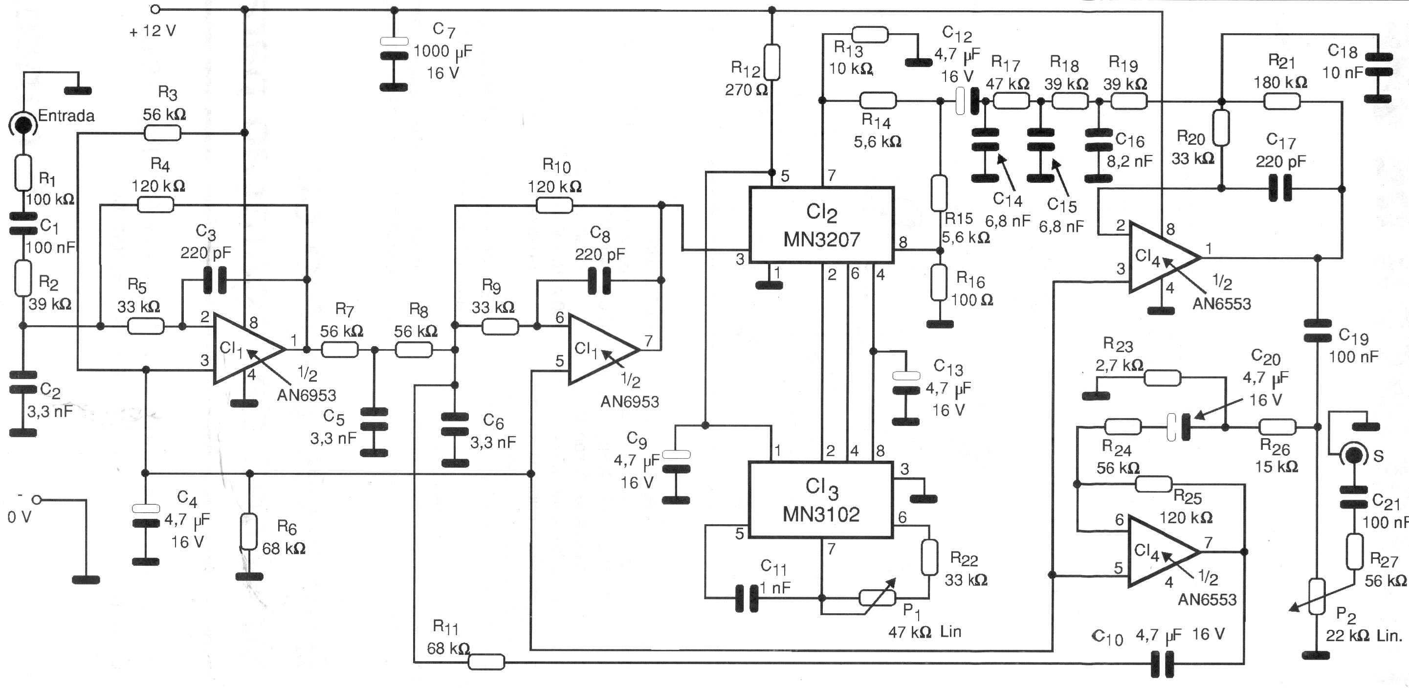 Los circuitos integrados utilizados en este proyecto de 1999 son bastante raros actualmente, lo que dificulta su realización práctica en nuestros días. El circuito tiene una tecnología de "brigada de baldes" utilizada en la época con excelentes resultados prácticos. La fuente debe tener un excelente filtrado y los cables de entrada y salida de señales blindadas.