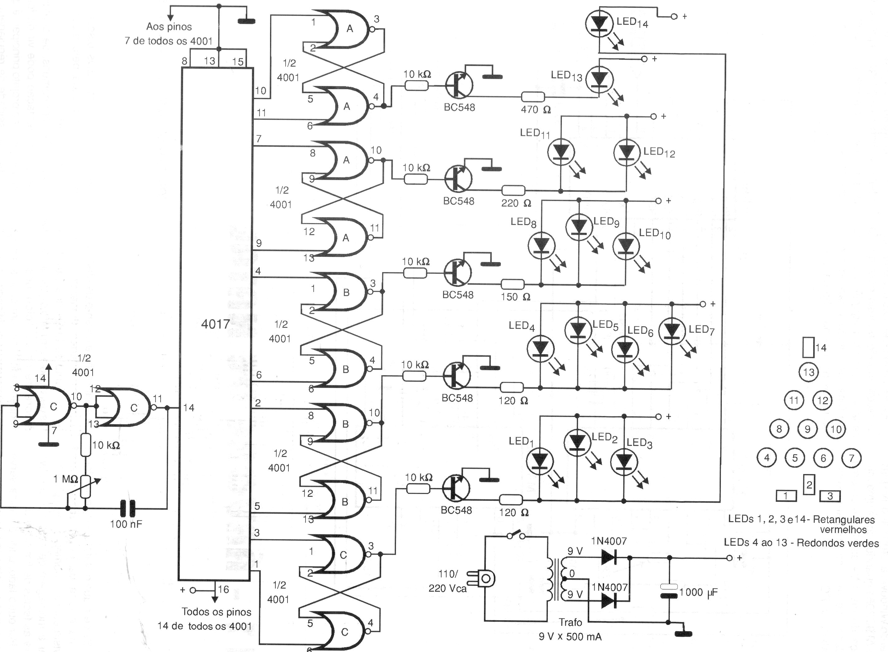 Este circuito interesante de árbol de navidad electrónica usando LEDs e integrados CMOS fue encontrado en una documentación de 1999. Alimentado por tensiones de 6 a 12 V o por la fuente dada junto al diagrama, hace que se obtengan efectos especiales en un conjunto de LEDs dispuestos en la forma de un árbol de navidad.