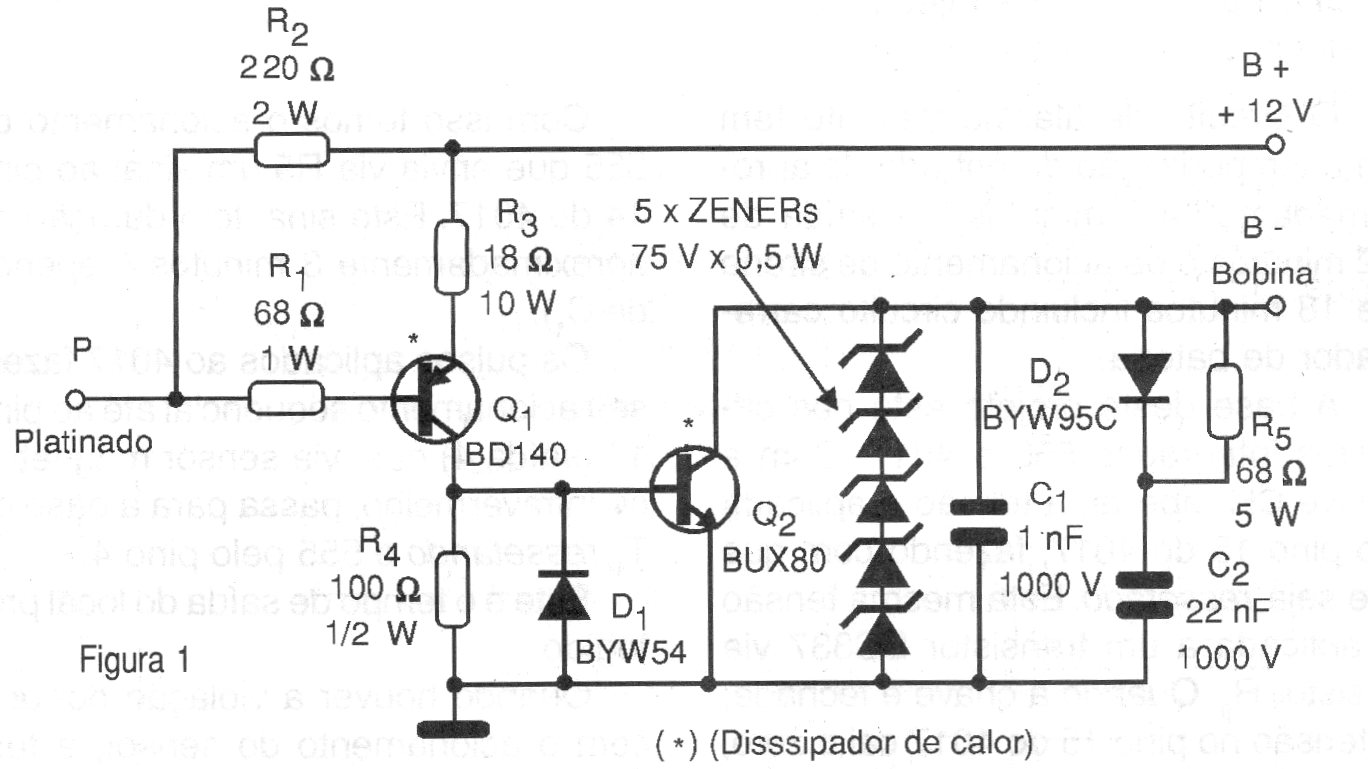 Este circuito es de 1999, cuando la mayoría de los vehículos todavía no poseía ignición electrónica y utilizaba platinados. El circuito consiste en una ignición asistida en la que el platino controla un circuito electrónico para producción de alta tensión. El transistor de potencia debe montarse en un excelente disipador de calor.