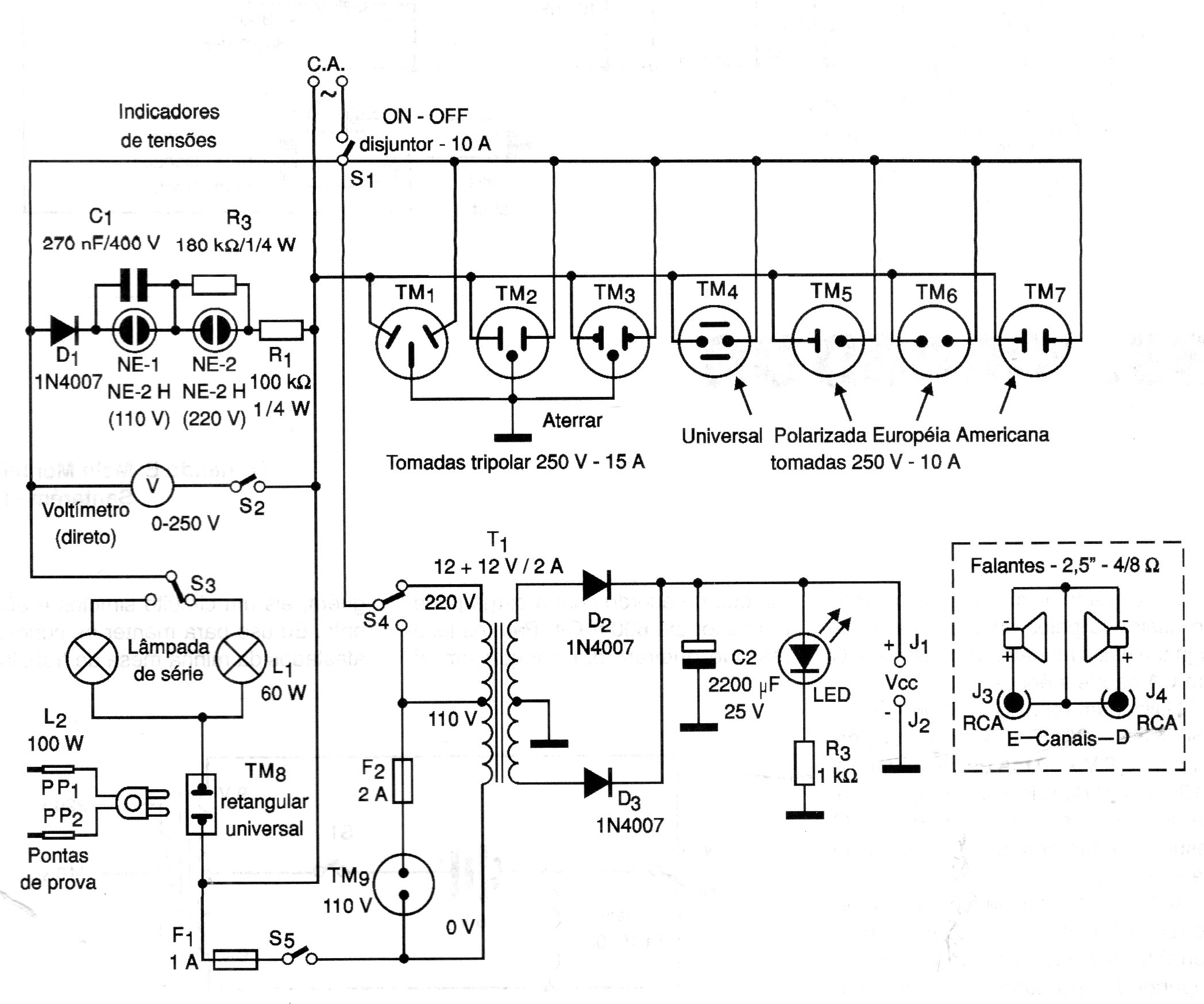 Este circuito puede equipar a la bancada del practicante de electrónica con excelente cantidad de recursos. Además de las tomas protegidas por fusibles existen indicadores, una lámpara de serie para pruebas y una fuente simple, además de altavoces de pruebas. Las tomas son del tipo en uso en 2001, año de la publicación en que encontramos el circuito.