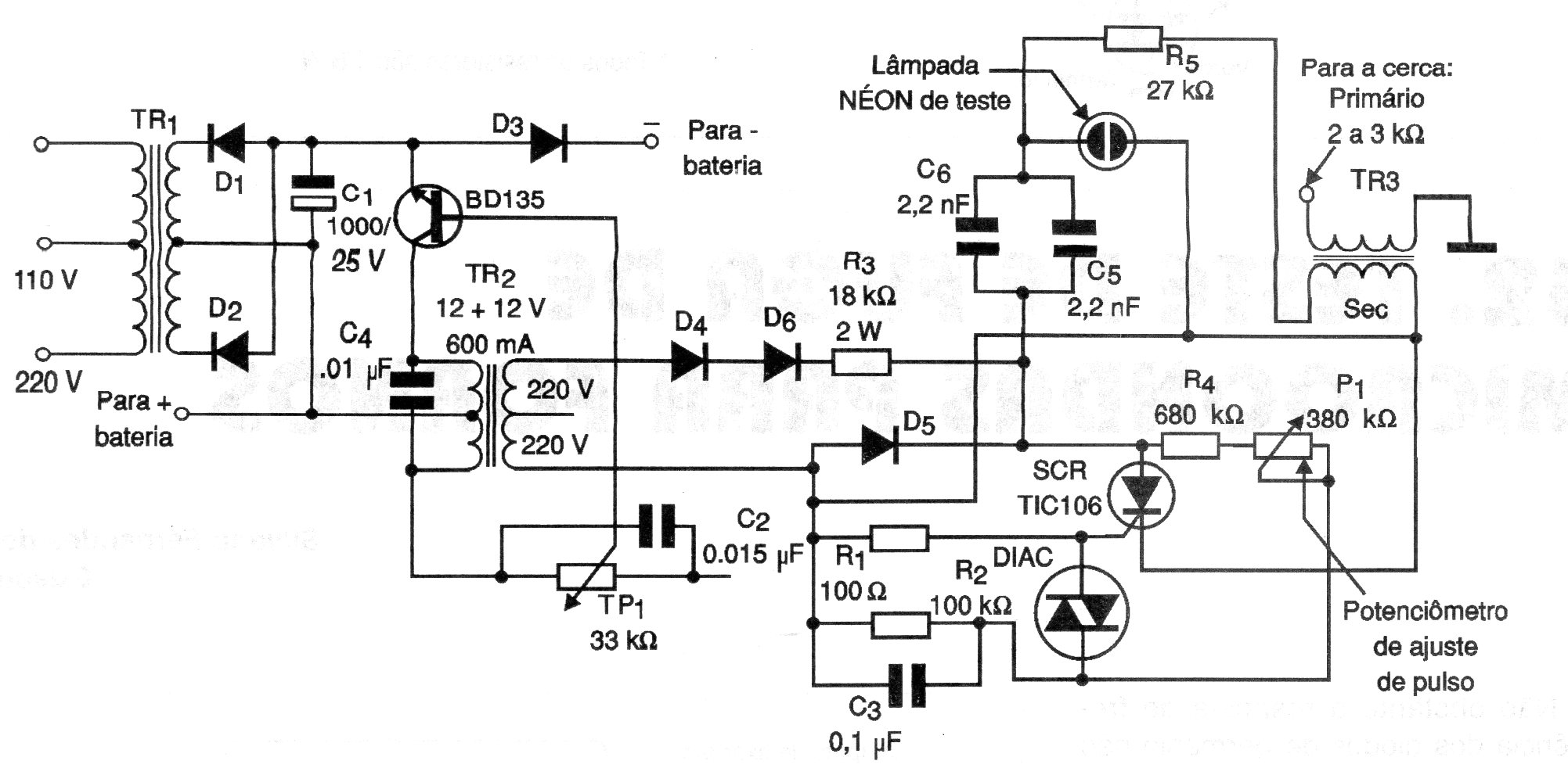 Encontramos este circuito en una documentación de 2001. Es seguro, pues utiliza transformador de aislamiento y al mismo tiempo proporciona una elevada tensión capaz de electrificar cercas de hasta 40 km según el autor del proyecto. Por supuesto, el hilo de la cerca debe estar aislado. El transformador T3 es del tipo flyback aprovechado de un televisor analógico en el que se pueden enrollar unas 20 espiras de hilo común en el núcleo expuesto.