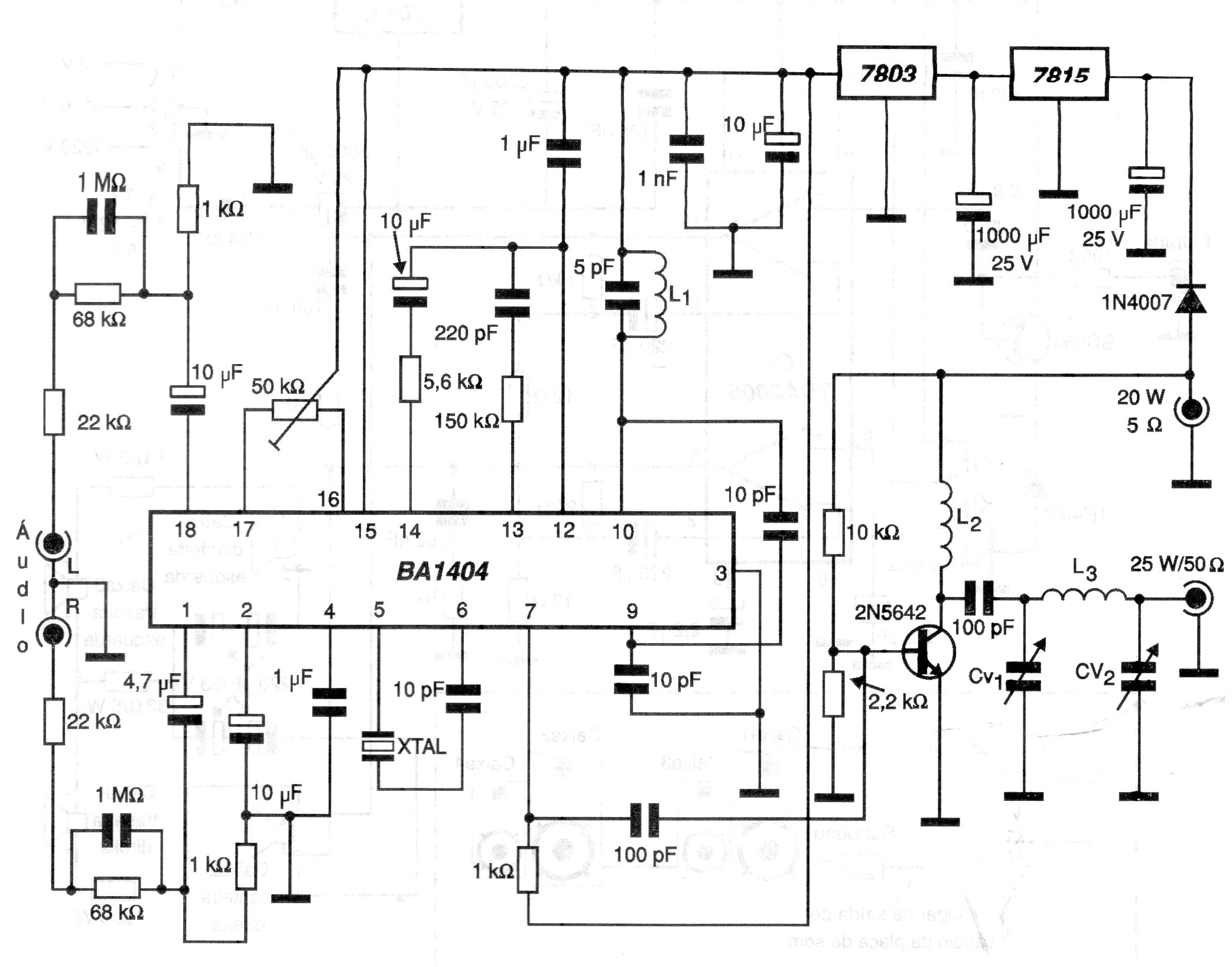 El circuito integrado utilizado en este proyecto de 2001 no es muy común. El circuito tiene una excelente etapa de potencia y el circuito integrado ya consiste en un transmisor. L1 tiene 3 espiras de hilo 22 sin núcleo. L2 tiene 3 espiras de hilo 18 sin núcleo y L3 7 espiras de hilo 22 sin núcleo. Todas se enrollan con un diámetro de 1 cm. El cristal es de 38 kHz para el transmisor estéreo.