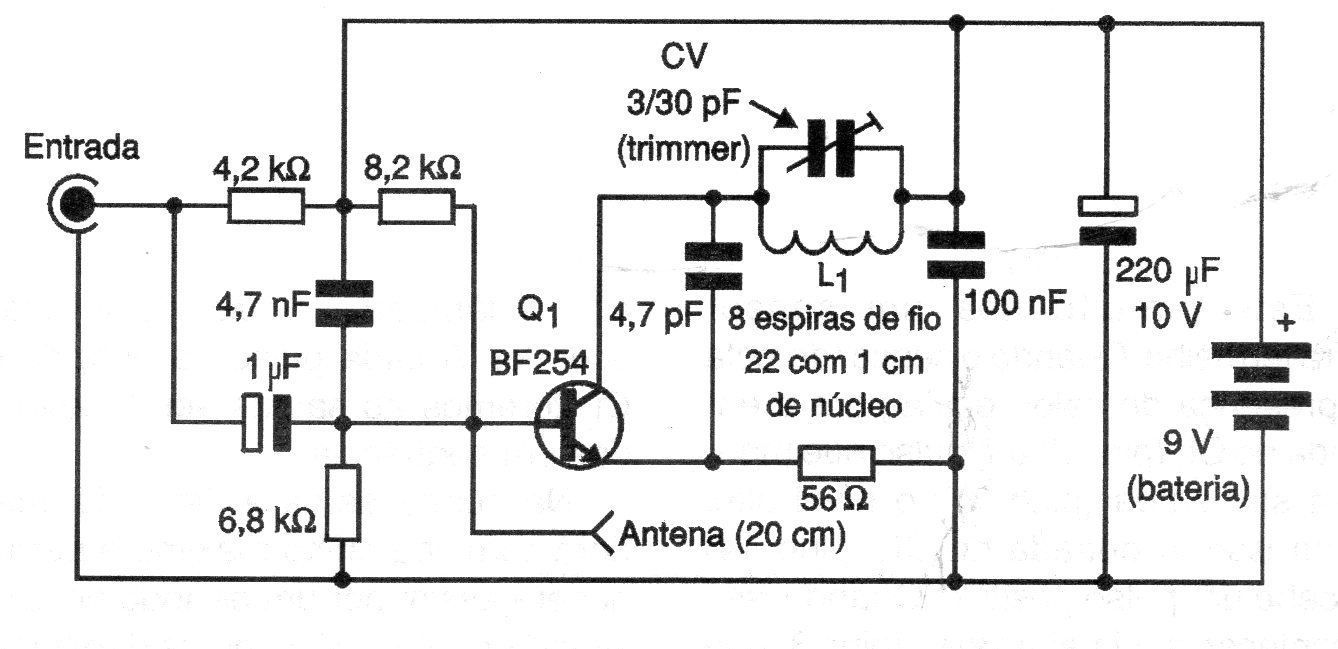 Los micrófonos y otras fuentes de señal se pueden conectar en la entrada de este circuito, siendo el capacitoror de 4,7 uFD eventualmente alterado según la calidad de sonido deseada. La bobina tiene 4 espiras de hilo 22 a 26 en forma de 1 cm sin núcleo y la antena puede ser un pedazo de hilo de 20 a 40 cm.