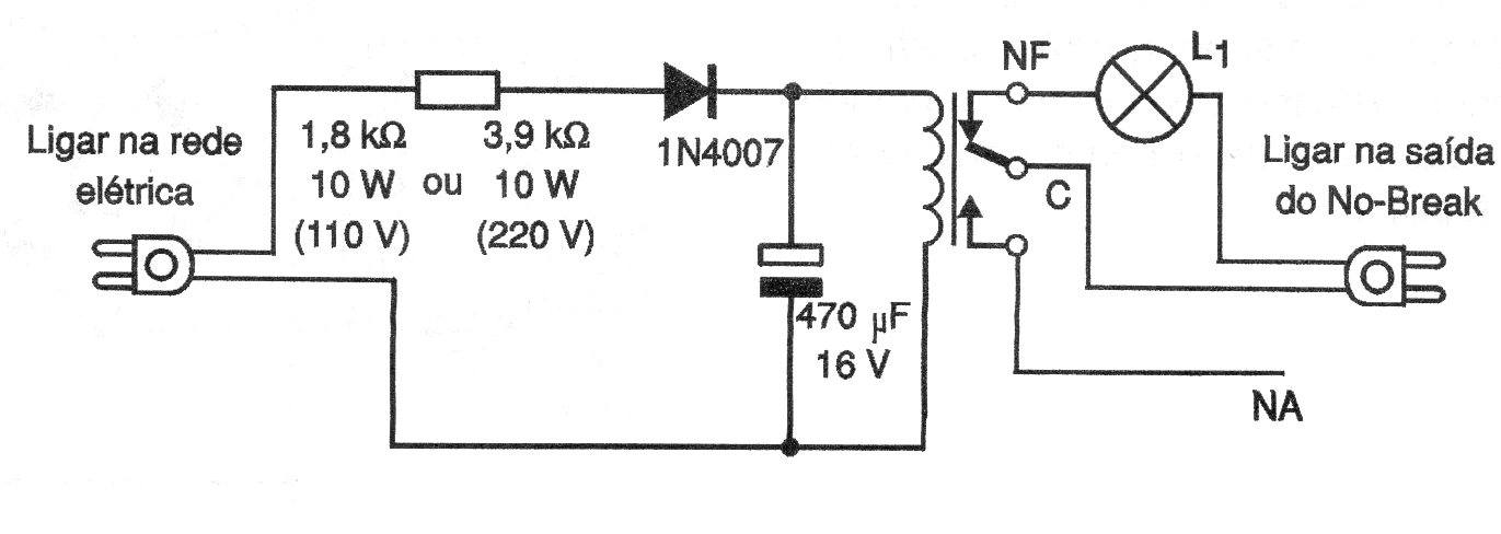 La idea de este circuito es utilizar un SAI de computadora para alimentar una luz de emergencia cuando falta energía. El circuito puede alimentar cualquier tipo de lámpara a 110 V y su autonomía será tanto mayor cuanto menor sea el consumo de la lámpara. El relé es del tipo sensible a 12 V.