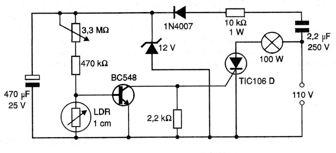 Este circuito acciona una lámpara incandescente al anochecer y apaga al amanecer. El sensor es un LDR y el SCR debe estar dotado de un disipador de calor. El circuito no funciona con otros tipos de lámpara y el ajuste de sensibilidad se debe hacer en el potenciómetro o trimpot.